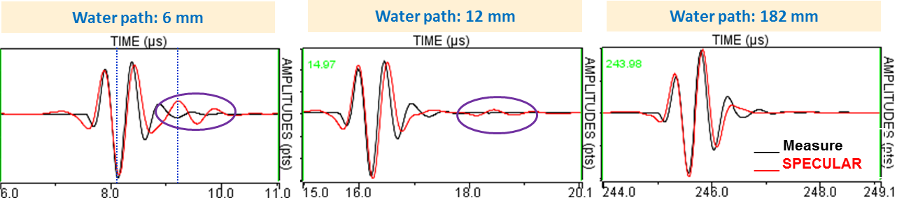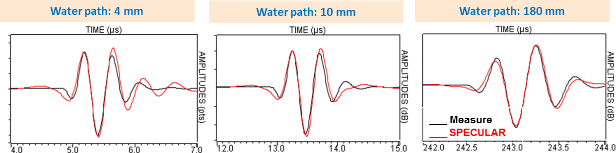 The measured and simulated Ascans with specular model are represented here below for three water paths, the red curve corresponds to the specular model and the black one to measurements.