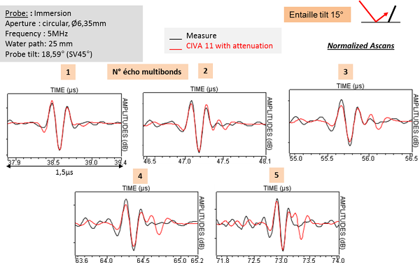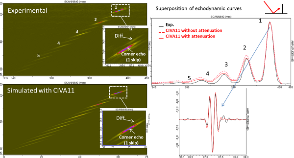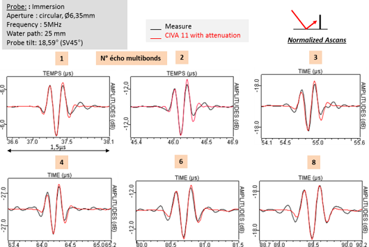 The comparison between simulation and experiment multi-skip echoes n°1 to 5 shows a good agreement. However, there are differences between experimental and simulated echodynamic curves: the simulated echoes are wider than experimental ones when the number of skips is greater than or equal to 2.
