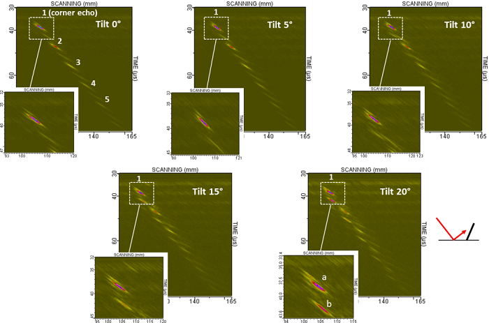 Experimental Bscan obtained with 0° to 20° tilted notches (opened tilt angles) are presented below.
