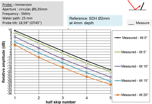 The multi-skip echoes amplitude decreases linearly with the number of skips and does not depend on the tilt. There is 28 dB difference between multi-skip echo n°1 and n°5.