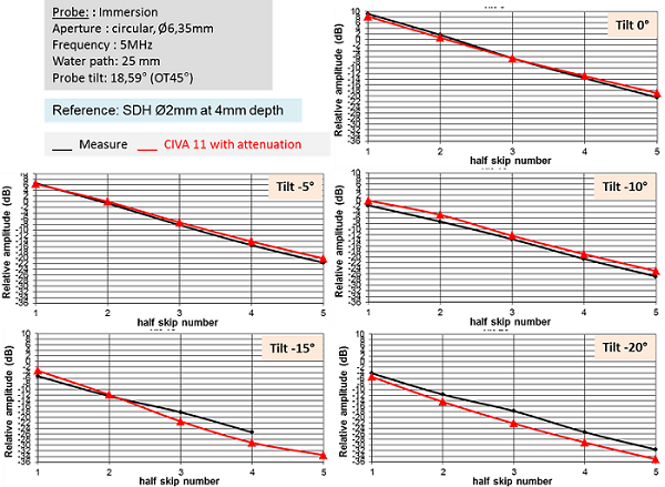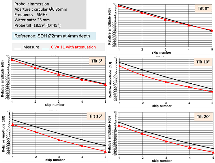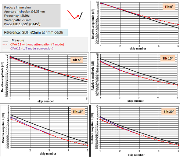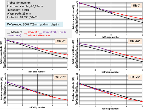 CIVA 11 makes good prediction of the amplitude decrease with the number of skips. However, whatever the number of skips, when the tilt becomes greater or equal to 10°, CIVA underestimates the echoes amplitude. The differences between measured and simulated echoes reach 4 to 5 dB on the 15° tilted notch. Because this happens with all the multi-skip echoes, the difference is not due to simulated attenuation.
