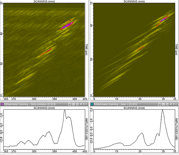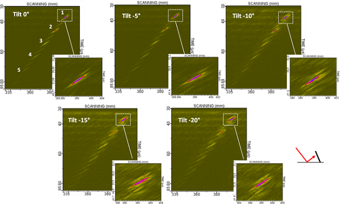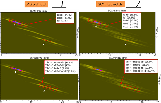 Inspections of backwall breaking notches, in a 5 mm depth planar specimen were performed with a 5 MHz immersion probe. The incidence angle of the probe was chosen in order to generate T45° waves in the mock-up.