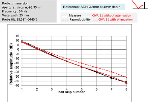 Experimental and simulated maximum amplitude of multi-skip echoes are plotted below. The curves show that the amplitude decreases linearly with the number of skips. There are 46 dB differences between the amplitude of echo n°1 and echo n°8. This behavior is correctly reproduced by CIVA 11 (maximal error of 2 dB) when attenuation is taken into account.