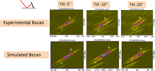 However, the comparison of experimental and simulated Bscans shows that contributions b and c (see figure below) are not correctly predicted. These ones won’t be studied in this document.