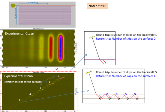 The figure below shows a Cscan of a vertical notch. The Bscan is extracted at the middle of the defect (red dotted line on the Cscan). The echoes with the highest amplitude (n°1 to 5 on the figure) are named “multi-skip” echoes and are associated with ultrasonic paths for which the difference between the number of skips on the backwall while round trip (probe to notch) and the number of skips on the surface while return trip is equal to 1.