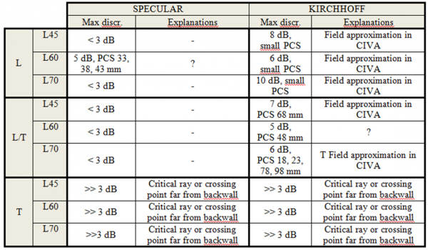 The differences between the amplitudes of the measured and with the SPECULAR model simulated T backwall echoes at θ angles greater than the critical angle of 33 ° may be due to the T field emitted on the echogenic area on piece backwall that is poorly predicted by CIVA as this area is far from the T sensors axis. Indeed, the diffraction phenomena of the sensor are taken into account in an approximate way when calculating L (T) field that radiates into the piece and this would lead to a prediction of the field even more false than the L (T) field is calculated far from the axis L (T) of the sensor. Thus, the higher the emitted field at the bottom is spatially resolved, the faster it is poorly predicted by CIVA when it moves away from the axis. But for those inspections, the width of the focal spot of the T field is much smaller than the one of the L field on backwall (See Figure 36, L60 ° inspection case). The discrepancies observed between the amplitudes of the measured and with the Kirchhoff model simulated T backwall echoes at θ angles greater than the critical angle can be explained in the same way and can be added to the gaps caused by the approximate description of the invalid field in these cases.