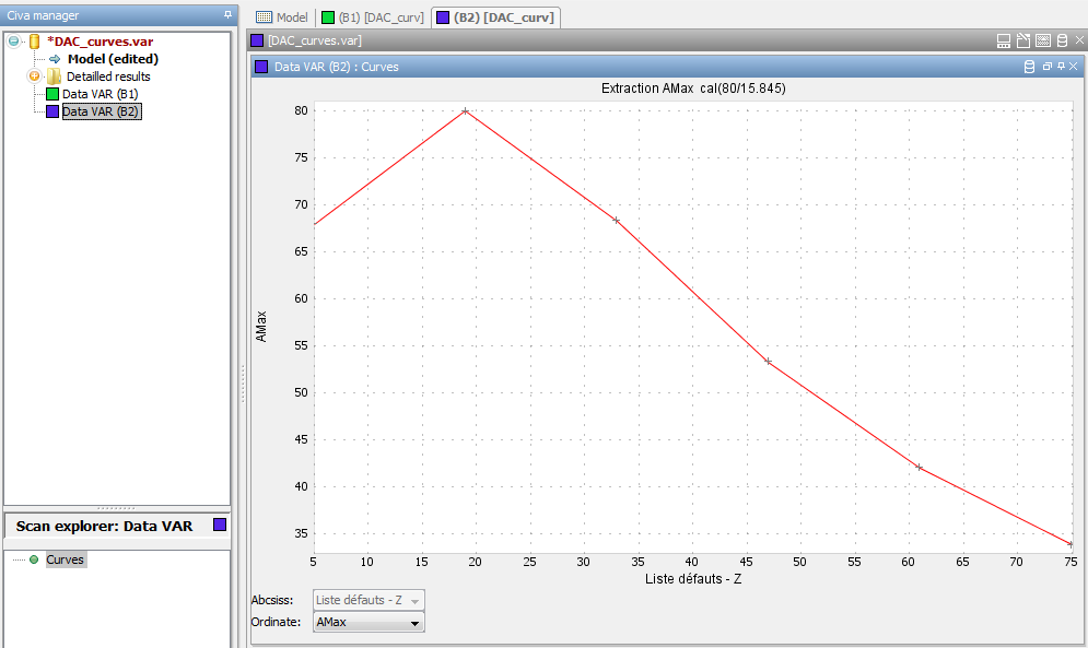 By default, the variation curve of an extracted quantity (Amax for example) is a function of one of the varying parameter in CIVA points.