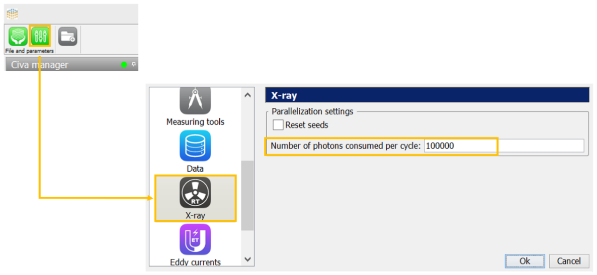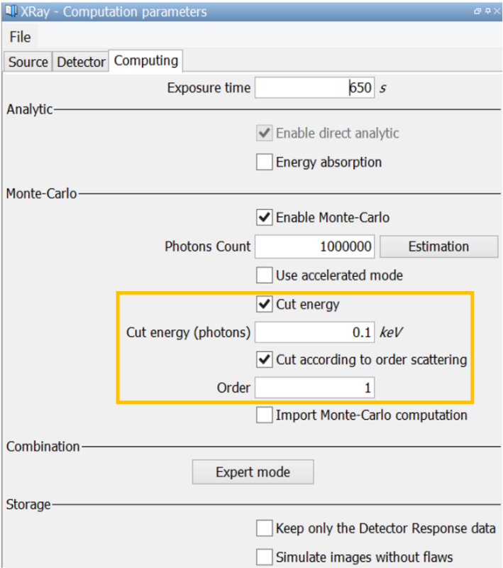 Cut according to order scattering: By default, CIVA can simulate up to 10 orders of scattering for a given photon. This option allows you to stop the propagation of the photon if it has reached the number of order scattering defined.