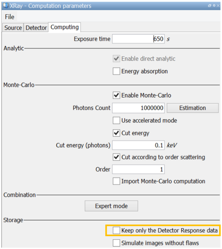 Combining BL and Monte-Carlo calculations generates lot of images that are not always useful for the user. When the user doesn’t need to see those results, it is possible to select the “Keep only the Detector response data” option. By doing so, only images from “Response detector” or “Optical density” will be stored, and the memory size of the configuration will be significantly reduced (especially for CT configurations, for which results can exceed 100 Go of memory).