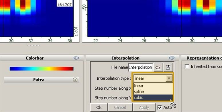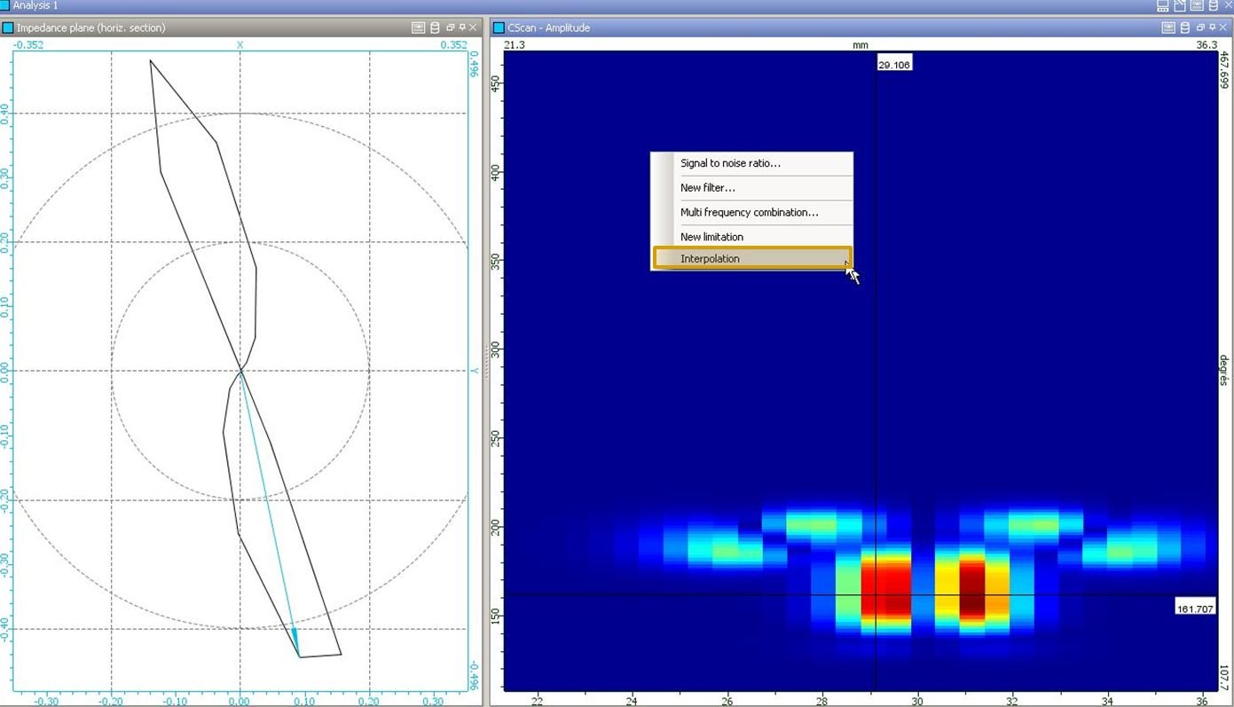 Then, the C-Scan is duplicated in the current page and, in the toolbox at the bottom of the window, 3 interpolation functions are proposed to the user: Linear, Spline and Cubic (actually Cubic Spline). Cubic Spline algorithm is quite popular as an interpolation function; this choice is sometimes detailed in analysis procedures.